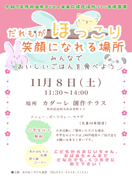 由利本荘市1市7町の巡回型子ども食堂を開催することで子どもは地域の宝、子育てを応援し、地域の方と繋がりみんなの居場所となる。