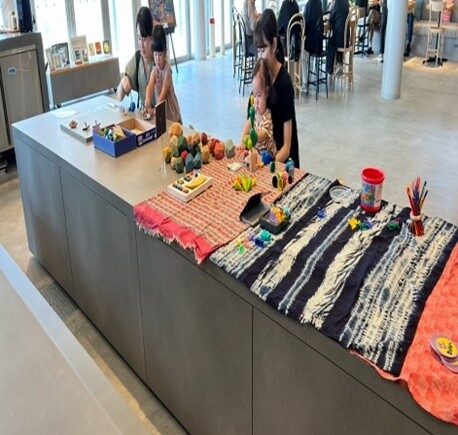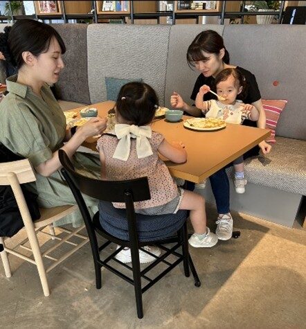 木のおもちゃ広場や折り紙コーナー、ゲームコーナーもあり、さらに食の大切さを伝えるために遊び感覚で食育コーナーを設けている。何気ない会話から、みんなの絆が生まれていきます。
